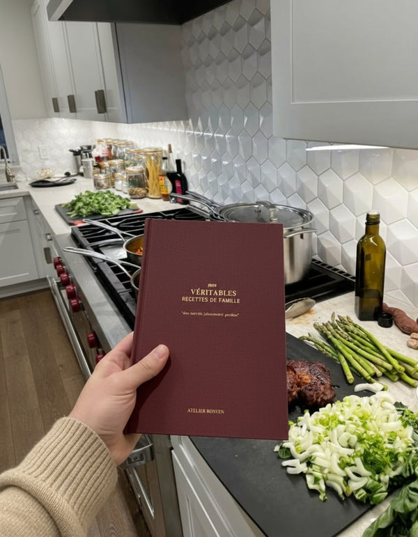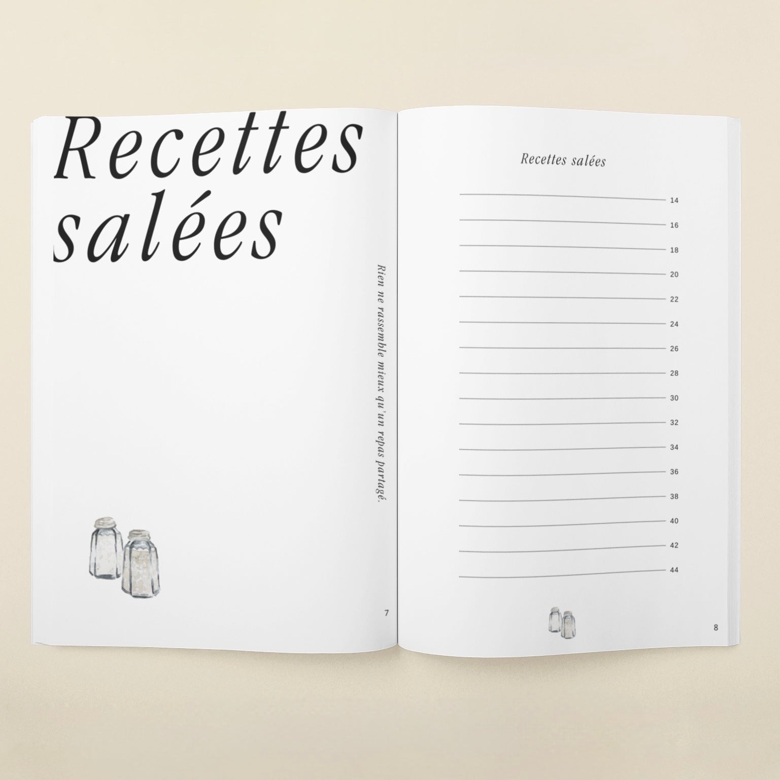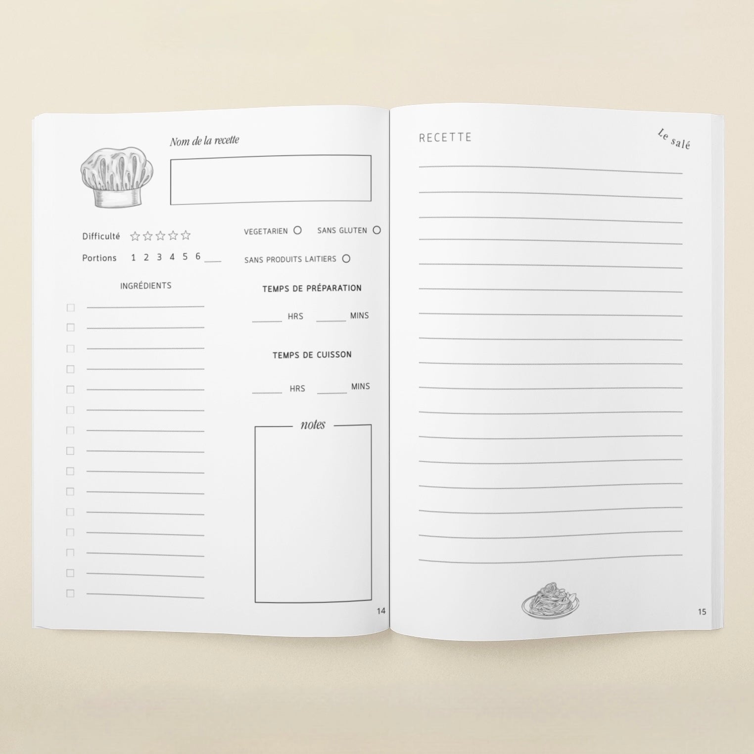 C’est un carnet élégant à remplir vous-même, pensé pour conserver et transmettre vos recettes préférées. Chaque page est conçue pour accueillir vos plats salés et sucrés, avec de la place pour les ingrédients, le temps de préparation, les instructions et vos notes personnelles.